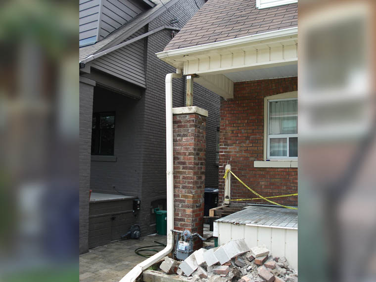 Demolish brickwork and stone coping then reclaim, rebuild foundation and install metal re-bar foundation to brickwork approx. 6′ ft. then build brick columns/pillars matching existing work or historical, then install coping and re-install existing wood column.